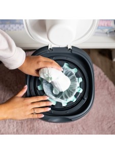El Contenedor Twist & Click es muy fácil de utilizar. Solo hay que abrir la tapa, colocar el pañal sucio en el agujero del contenedor, girar el aro hasta que oigas clic y cerrar la tapa.