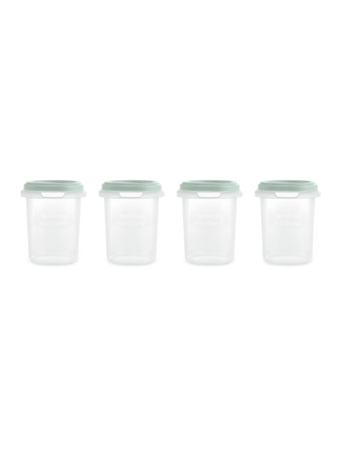 Set de cuatro recipientes herméticos de 250 ml con diseño transparente. Ideales para almacenar, congelar y descongelar la comida de tu bebé según lo necesites. Cuentan con medidas en el lateral para ajustar cada porción y un espacio donde escribir con lápiz la fecha o el tipo de alimento. Su tapa en tono mint pertenece a la colección Terra de Miniland.